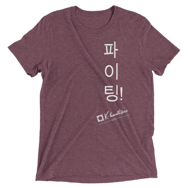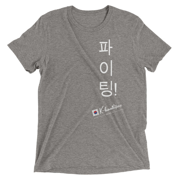 파이팅! (Pai ting!) - “Fighting!” - The ultimate Konglish encouragement! Whether it’s a tough exam, an upcoming interview or even a blind date - show the world that you are ready for the challenge! The tri-blend fabric creates a vintage, fitted look. And extreme durability makes this t-shirt withstand repeated washings and still remain super comfortable.